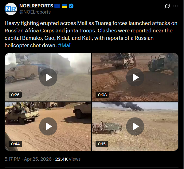 Heavy fighting erupted across Mali as Tuareg forces launched attacks on Russian Africa Corps and junta troops. Clashes were reported near the capital Bamako, Gao, Kidal, and Kati, with reports of a Russian helicopter shot down. #Malihttps://x.com/NOELreports/status/2048073949255221657?s=20>25thvideo 1https://streamable.com/kbaq0fvideo 2https://streamable.com/06o280video 3https://streamable.com/vbn604video 4https://streamable.com/qn5ldy