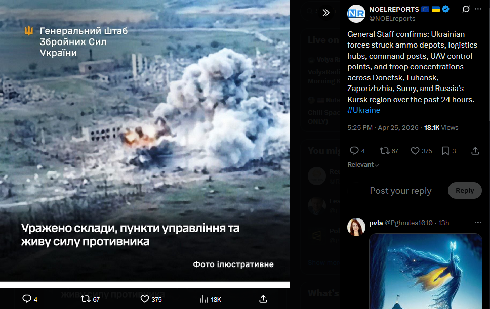 General Staff confirms: Ukrainian forces struck ammo depots, logistics hubs, command posts, UAV control points, and troop concentrations across Donetsk, Luhansk, Zaporizhzhia, Sumy, and Russia’s Kursk region over the past 24 hours. #Ukrainehttps://x.com/NOELreports/status/2048075854274531678?s=20>25th