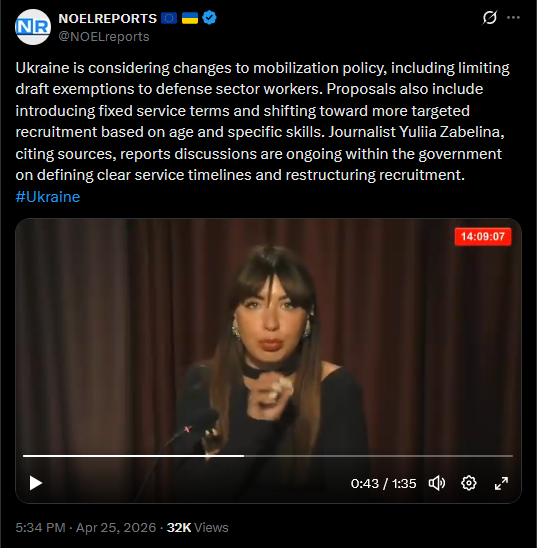 Ukraine is considering changes to mobilization policy, including limiting draft exemptions to defense sector workers. Proposals also include introducing fixed service terms and shifting toward more targeted recruitment based on age and specific skills. Journalist Yuliia Zabelina, citing sources, reports discussions are ongoing within the government on defining clear service timelines and restructuring recruitment. #Ukrainehttps://x.com/NOELreports/status/2048078100114935827?s=20>25th