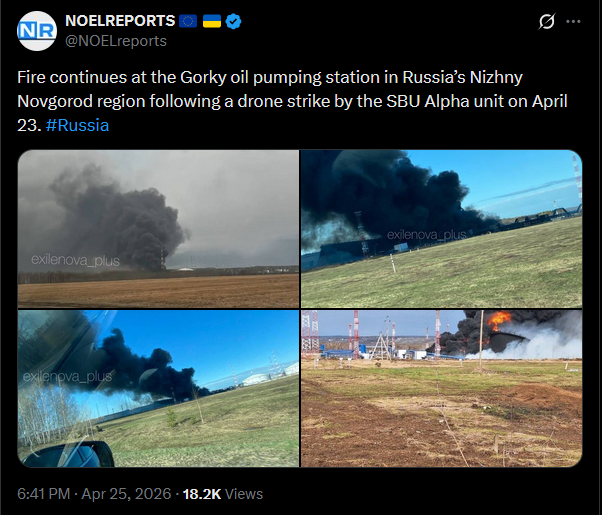 Fire continues at the Gorky oil pumping station in Russia’s Nizhny Novgorod region following a drone strike by the SBU Alpha unit on April 23. #Russiahttps://x.com/NOELreports/status/2048094995878474046?s=20>25thpic 1https://streamable.com/dholr2pic 2https://streamable.com/w8nn0jpic 3https://streamable.com/bst8z2pic 4https://streamable.com/j233q7