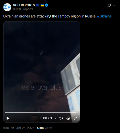 Ukrainian drones are attacking the Tambov region in Russia. #Ukrainehttps://x.com/NOELreports/status/2048132489659429171?s=20>25thhttps://streamable.com/hiqmjmLoud explosions in occupied Sevastopol, Crimea. Air defense is active. Local authorities claim a massive drone attack is underway. #Ukrainehttps://x.com/NOELreports/status/2048132941356654796?s=20>25th