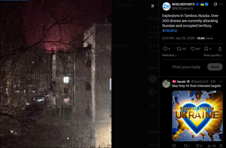Explosions in Tambov, Russia. Over 300 drones are currently attacking Russian and occupied territory. #Ukrainehttps://x.com/NOELreports/status/2048138412478107869?s=20>25th