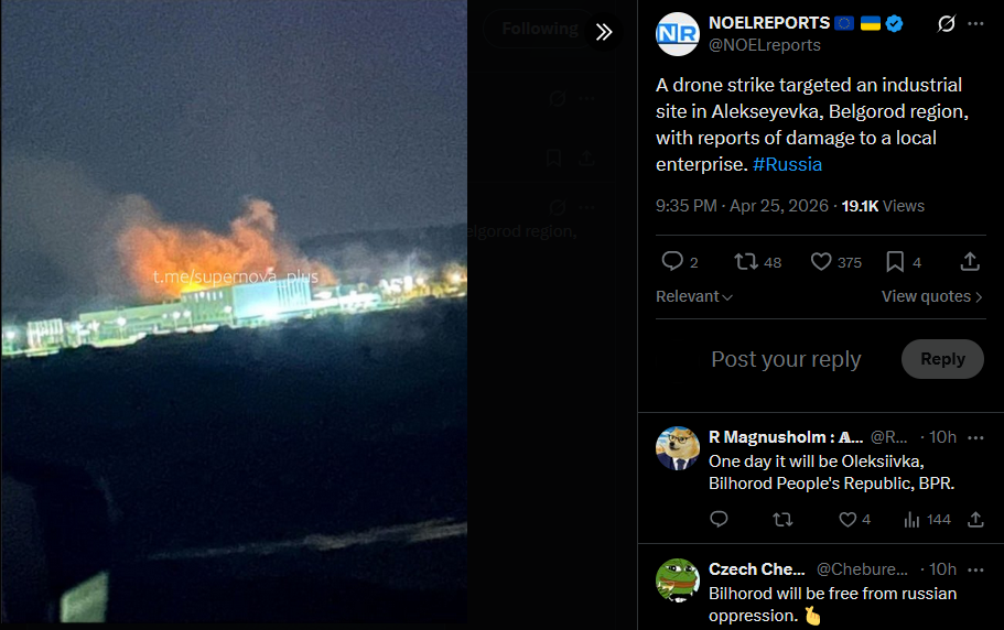 A drone strike targeted an industrial site in Alekseyevka, Belgorod region, with reports of damage to a local enterprise. #Russiahttps://x.com/NOELreports/status/2048138826707525755?s=20>25th