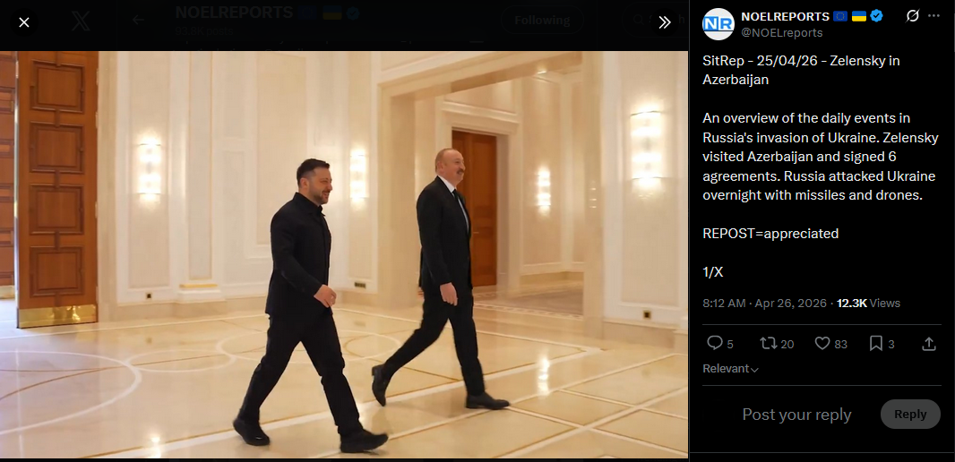 SitRep - 25/04/26 - Zelensky in AzerbaijanAn overview of the daily events in Russia's invasion of Ukraine. Zelensky visited Azerbaijan and signed 6 agreements. Russia attacked Ukraine overnight with missiles and drones.https://x.com/NOELreports/status/2048299040853336499?s=20