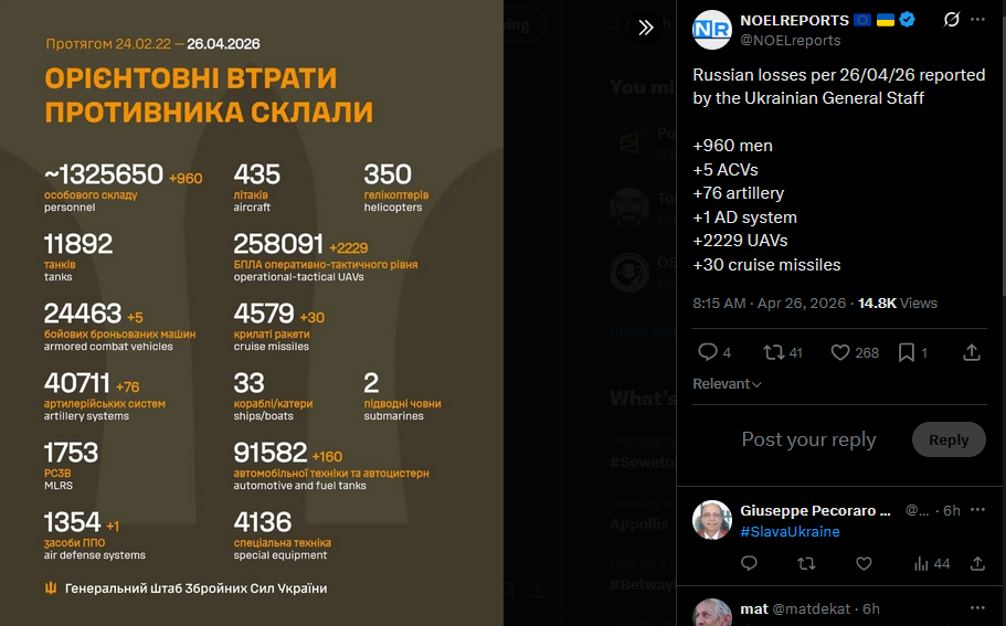 Russian losses per 26/04/26 reported by the Ukrainian General Staff+960 men+5 ACVs+76 artillery+1 AD system+2229 UAVs+30 cruise missileshttps://x.com/NOELreports/status/2048299954288885863?s=20