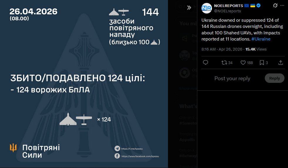 Ukraine downed or suppressed 124 of 144 Russian drones overnight, including about 100 Shahed UAVs, with impacts reported at 11 locations. #Ukrainehttps://x.com/NOELreports/status/2048300117875208304?s=20>26th