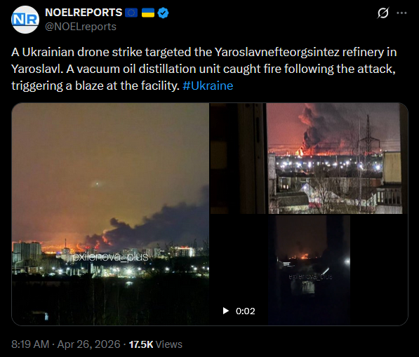 A Ukrainian drone strike targeted the Yaroslavnefteorgsintez refinery in Yaroslavl. A vacuum oil distillation unit caught fire following the attack, triggering a blaze at the facility. #Ukrainehttps://x.com/NOELreports/status/2048300905758351698?s=20>26thpic 1https://streamable.com/zma2ijpic 2https://streamable.com/nc0d4fvideohttps://streamable.com/gp10gb
