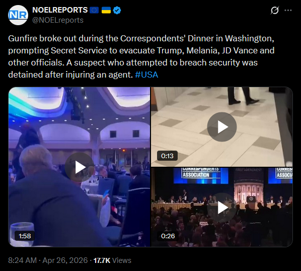 Gunfire broke out during the Correspondents' Dinner in Washington, prompting Secret Service to evacuate Trump, Melania, JD Vance and other officials. A suspect who attempted to breach security was detained after injuring an agent. #USAhttps://x.com/NOELreports/status/2048302182340907172?s=20>26thvideo 1https://streamable.com/vyr064video 2https://streamable.com/m2l2unvideo 3https://streamable.com/h2ls01