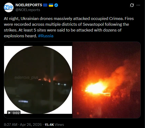 At night, Ukrainian drones massively attacked occupied Crimea. Fires were recorded across multiple districts of Sevastopol following the strikes. At least 5 sites were said to be attacked with dozens of explosions heard. #Russiahttps://x.com/NOELreports/status/2048302870378762715?s=20>26thvideo https://streamable.com/9dtfv9pic https://streamable.com/qu17oc