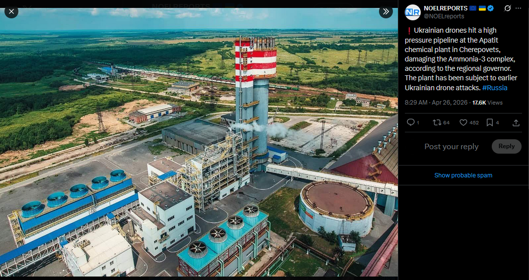 Ukrainian drones hit a high pressure pipeline at the Apatit chemical plant in Cherepovets, damaging the Ammonia-3 complex, according to the regional governor. The plant has been subject to earlier Ukrainian drone attacks. #Russiahttps://x.com/NOELreports/status/2048303531300401406?s=20>26th