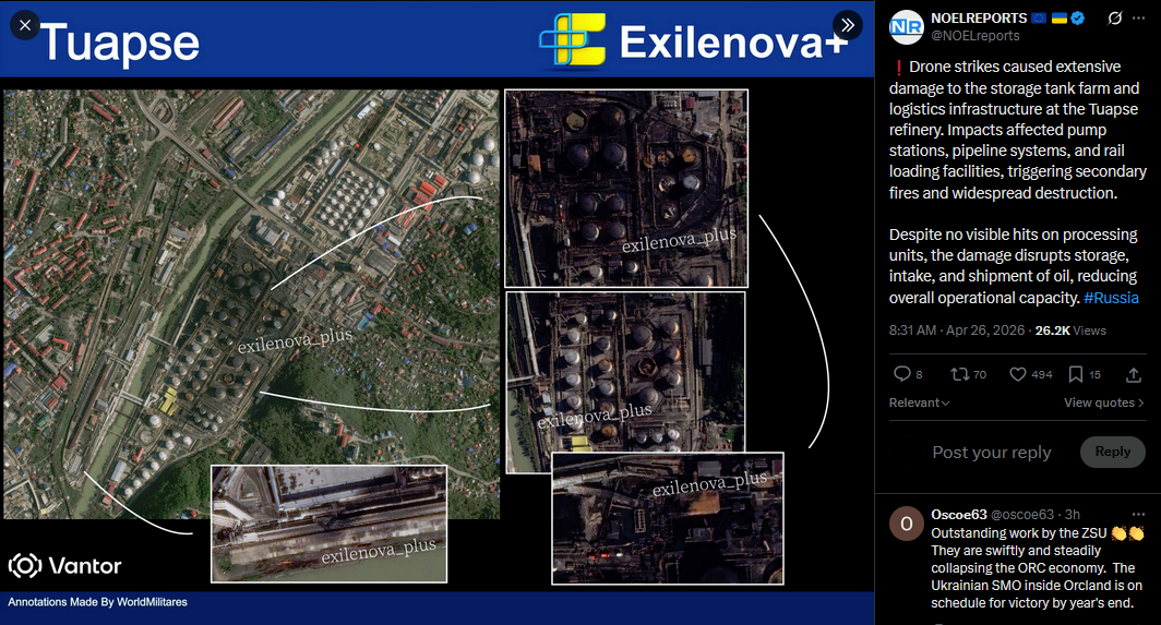 Drone strikes caused extensive damage to the storage tank farm and logistics infrastructure at the Tuapse refinery. Impacts affected pump stations, pipeline systems, and rail loading facilities, triggering secondary fires and widespread destruction.Despite no visible hits on processing units, the damage disrupts storage, intake, and shipment of oil, reducing overall operational capacity. #Russiahttps://x.com/NOELreports/status/2048304038530208152?s=20>26thhttps://streamable.com/ik2mbr