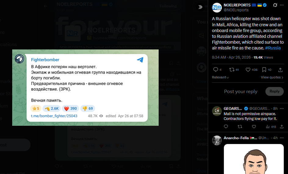 A Russian helicopter was shot down in Mali, Africa, killing the crew and an onboard mobile fire group, according to Russian aviation affiliated channel Fighterbomber, which cited surface to air missile fire as the cause. #Russiahttps://x.com/NOELreports/status/2048304656573436333?s=20>26th