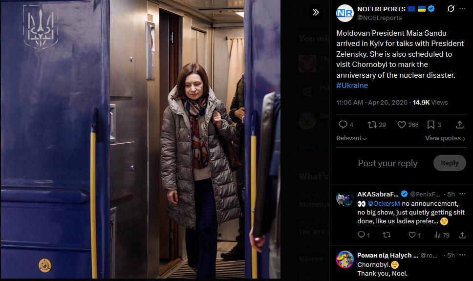 Moldovan President Maia Sandu arrived in Kyiv for talks with President Zelensky. She is also scheduled to visit Chornobyl to mark the anniversary of the nuclear disaster. #Ukrainehttps://x.com/NOELreports/status/2048342869803512033?s=20>26th