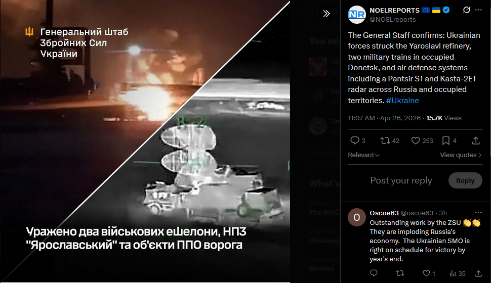 The General Staff confirms: Ukrainian forces struck the Yaroslavl refinery, two military trains in occupied Donetsk, and air defense systems including a Pantsir S1 and Kasta-2E1 radar across Russia and occupied territories. #Ukrainehttps://x.com/NOELreports/status/2048343252038726091?s=20>26th