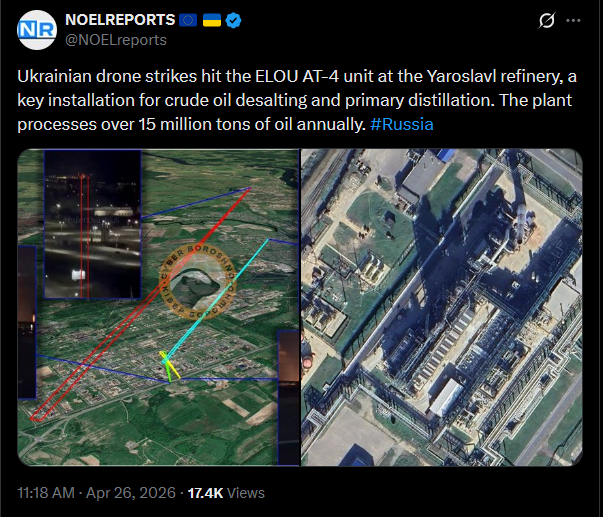 Ukrainian drone strikes hit the ELOU AT-4 unit at the Yaroslavl refinery, a key installation for crude oil desalting and primary distillation. The plant processes over 15 million tons of oil annually. #Russiahttps://x.com/NOELreports/status/2048345933230838035?s=20>26thpic 1https://streamable.com/em6wn6pic 2https://streamable.com/b0go1hPresident Zelensky announced that Ukraine will participate in the NATO summit on July 7-8 in Turkey, though the format and representatives are yet to be determined. #Ukrainehttps://x.com/NOELreports/status/2048377470160695791?s=20>26thUkraine's Energy Minister Denys Shmyhal stated that an EU loan will not cover the full cost of energy sector restoration, which requires 5.4 billion euros. Ukraine expects the first tranche of a 90 billion euro EU loan, with 17 billion euros anticipated for the budget this year. #Ukrainehttps://x.com/NOELreports/status/2048379825392439730?s=20>26th