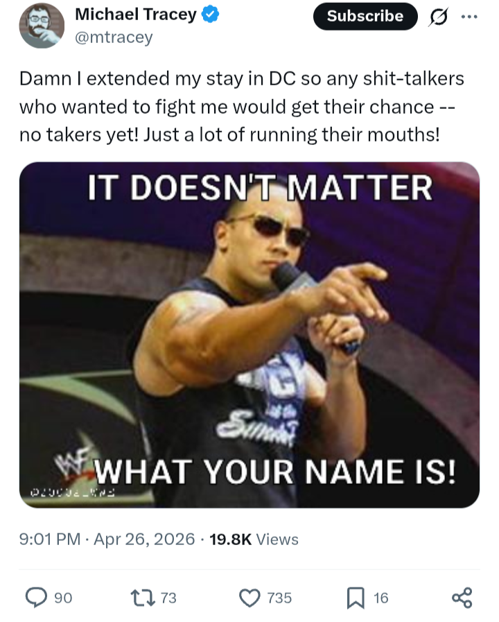 I am Michael Tracey's clenched fist.