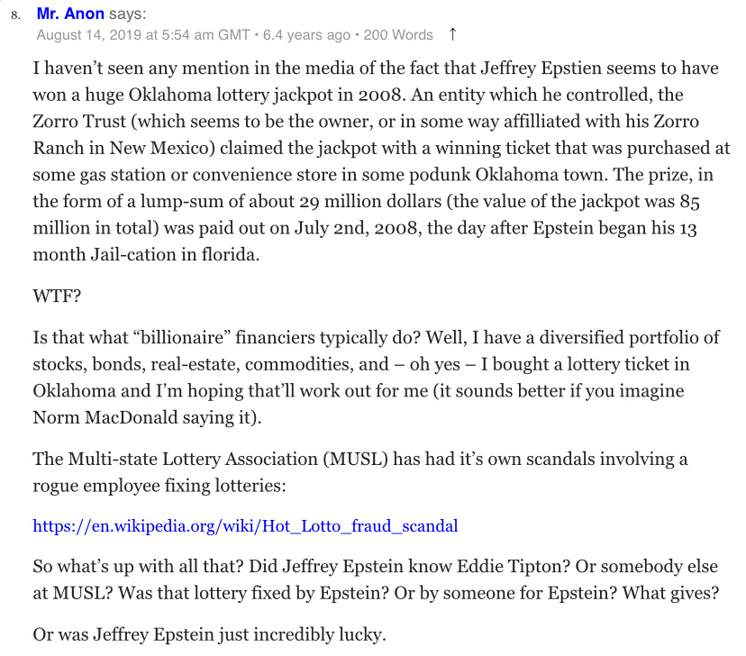 And this wasn't the only instance of fraud that Epstein took part in in 2008.Zorro Trust which was the owner of Epstein's Zorro Ranch also mysteriously collected an 85 Million Lottery Jackpot win 1 day after Epstein started to serve out his prison sentence in Florida.