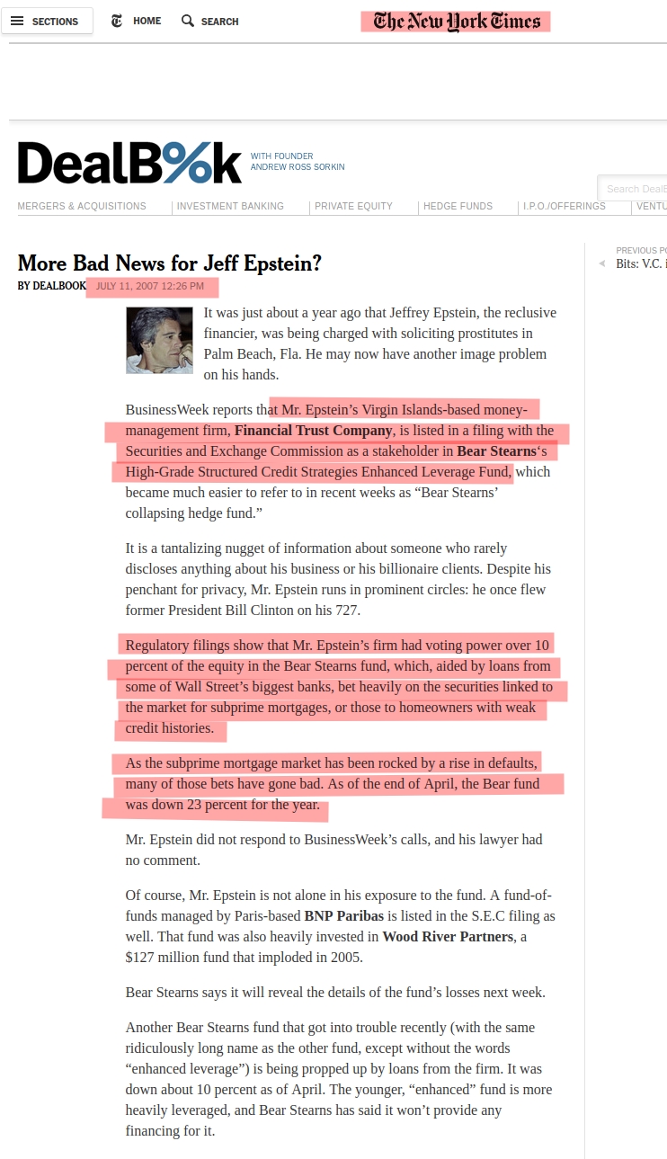 This New York Times article from 2007https://archive.is/kTd1n>Epstein’s Virgin Islands-based money-management firm, Financial Trust Company, is listed in a filing with the Securities and Exchange Commission as a stakeholder in Bear Stearns‘s High-Grade Structured Credit Strategies Enhanced Leverage Fund>Regulatory filings show that Mr. Epstein’s firm had voting power over 10 percent of the equity in the Bear Stearns fund, which, aided by loans from some of Wall Street’s biggest banks, bet heavily on the securities linked to the market for subprime mortgages, or those to homeowners with weak credit histories.>As the subprime mortgage market has been rocked by a rise in defaults, many of those bets have gone bad. As of the end of April, the Bear fund was down 23 percent for the year.