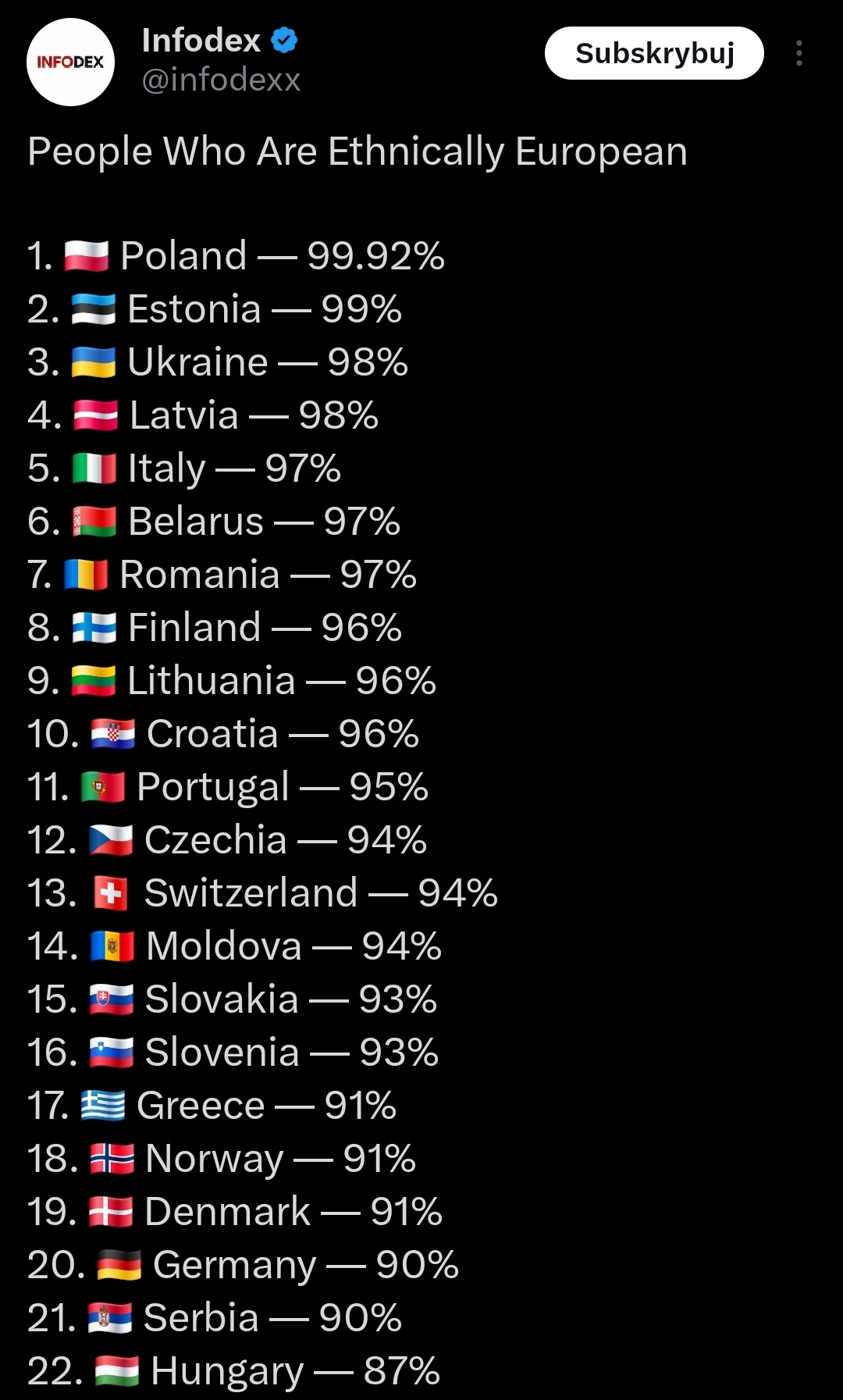 >>533967348Poland is an ethnostate. It isn't a country.It is where the Polish people live.Same for most of the countries at the top of the list.Latvia has no reason to exist other than as the homeland and cultural safe zone of the Latvian people.