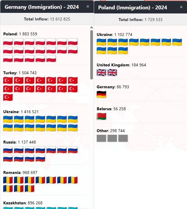 >>533967348>>533967417>>533967830>>533968257>>533969130Poland is a poor country from which people emigrateIt has very low birth-rate, quite large brain drain etcSo to answer the question - Poland is homogeneus because no one migrates thereInteresting map and interesting data. I don't know if they can be trusted, but this is supposed to be UN data.In 2024 more Poles emigrated to Germany (left side) than all the others who came to Poland(right side). https://migrantsontheglobe.com