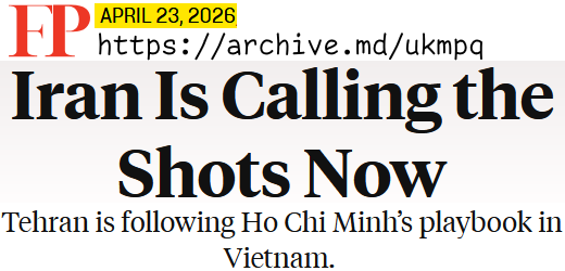 >>533969540IRAN IS CALLING THE SHOTS NOW>Tehran is following Ho Chi Minh's playbook in Vietnam>Iran is not yet “another Vietnam.” There are no U.S. ground forces taking unsustainable casualties, no headlines tallying the week’s dead, no massive anti-war protests in U.S. streets. But the pressure that Tehran is applying to Donald Trump suddenly feels very much like what flummoxed LBJ in Vietnam. Specifically, it resembles the winning strategy so doggedly pursued by Ho Chi Minh.>By resisting talks to end the war quickly and forcing Trump to extend his cease-fire indefinitely—which the president insisted he wouldn’t do only days ago—the Iranian leadership (whoever that might be) appears to be following Ho’s playbook.>Ho and his successor defeated two Western imperial powers—first France, then the United States—by understanding what Tehran appears to understand: Aggressors from far away, no matter how powerful, will tire of war well before you do. >“Iranians have advantages beyond what the Americans could comprehend,” Hai Nguyen, co-founder and director of the Global Vietnam Wars Studies Initiative at the Harvard Kennedy School says. “They understand that the U.S. could drop thousands of tons of bombs, but it does not possess the patience to withstand a prolonged war. Like the Vietnamese revolutionaries, the Iranians appear ready to fight a protracted war with much sacrifice of national resources.”>“This is what surrender looks like,” wrote former U.S. Ambassador to NATO Ivo Daalder. “It was Trump who wanted a ceasefire, seeing that further escalation wasn’t bringing Iran around and fearing the economic and political fallout of continuing the war. If Trump now extends the ceasefire indefinitely, Iran is fine with that. According to the Financial Times, citing cargo tracking group Vortexa, as of Tuesday, approximately 34 oil tankers linked to Iran have passed through the U.S. blockade.https://archive.md/ukmpq