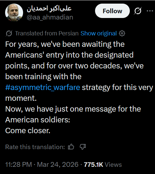 >>533981348I agree with you but also I think that's the plan. in case it's not clear I don't think the plan is going to work.we could shrug it of now and make a deal but we're too proud. the entire world economy will have to suffer for months before out leadership will be willing to suffer such izzat lossand to be clear I'm not just talking about Trump and I'm not just talking about the White House or even the Americans. look at the shit von der leyen, starmer, merz, milei, etc etc are saying. practically the entirety of white western civilization stands to be humiliated in this situation (oops shouldn't have supported jews). people compare this to the suez crisis but this is a much, much bigger deal than that. it can only end if the Iranian regime collapses, or if the western powers repudiate decades of their own rhetoric, admit that they were wrong, and recognize the legitimacy of the #1 enemy of Israel on earth.