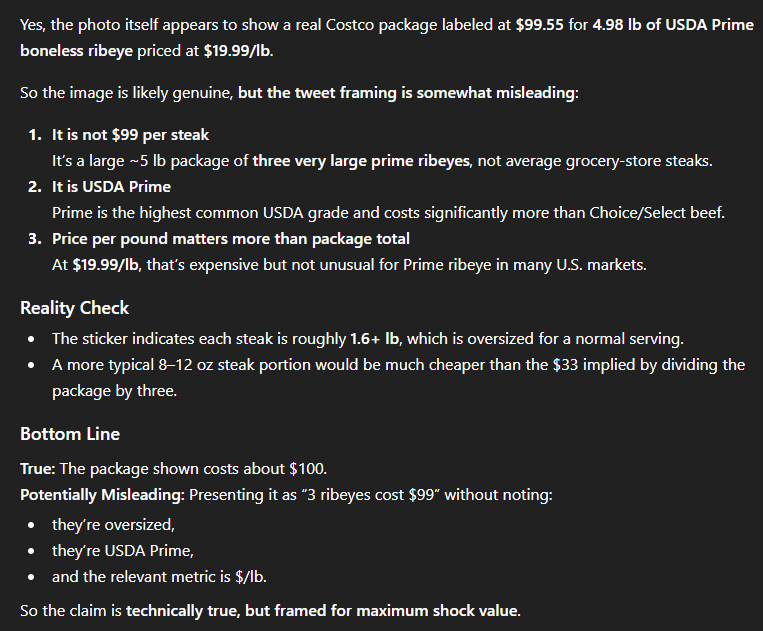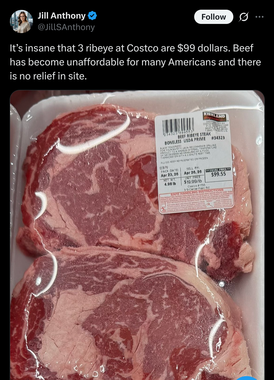 >>533985359USDA Prime is pretty much the same everywhere unless you're getting prime-better-than-prime from a specialty butcher. And my local whole foods doesn't carry USDA Prime beef, because Whole Foods shoppers generally have shitty taste and don't know squat about food, and it's worse every year. I rarely buy cut steaks from Costco because they mechanically tenderize them, but their beef is fine. Buy the subprimals and cut your own steaks.Beef prices are high right now, ngl, but that's a pretty average price for cut USDA prime ribeye steaks.