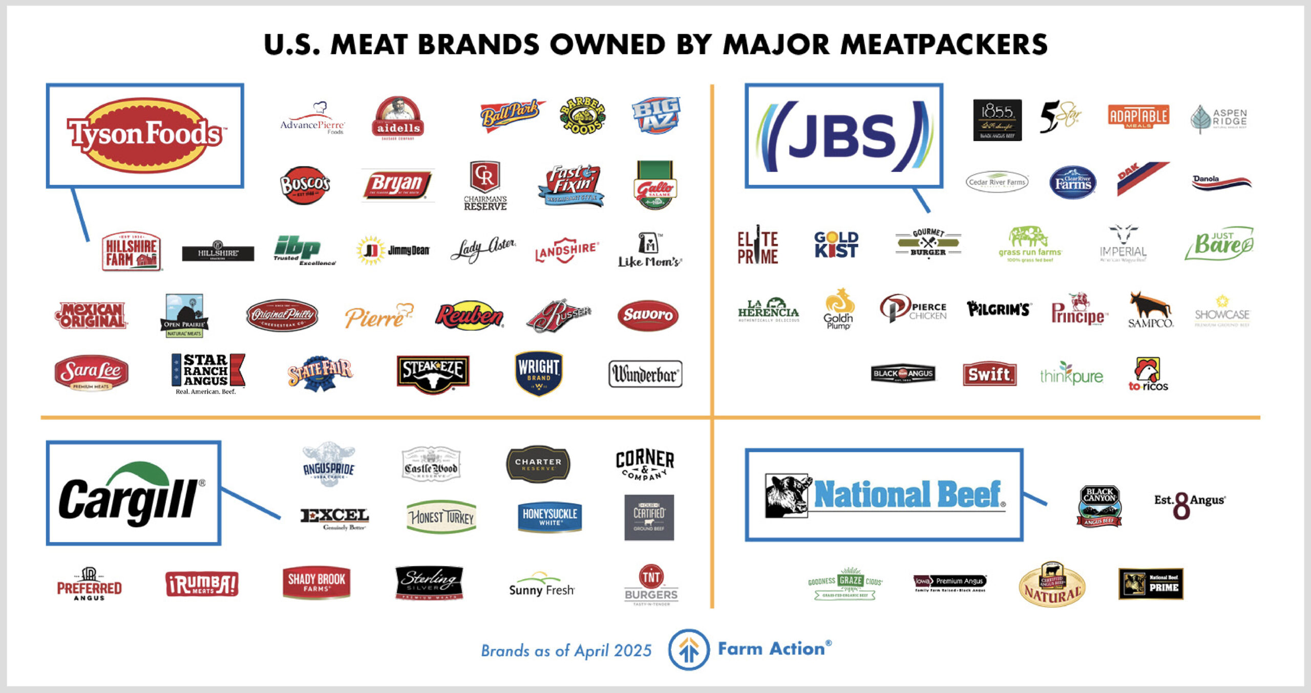 https://farmaction.us/behind-the-brands-the-meatpacking-monopoly-and-the-illusion-of-choice/>Meatpacking is one of the most consolidated industries in our food system. Of the more than 70 meat brands marketing to consumers and retailers under the guise of individual names and logos, just four corporations—Tyson, JBS, Cargill, and National Beef—are behind these brands. >These four meatpacking giants control a staggering 80-85% of the beef industry.
