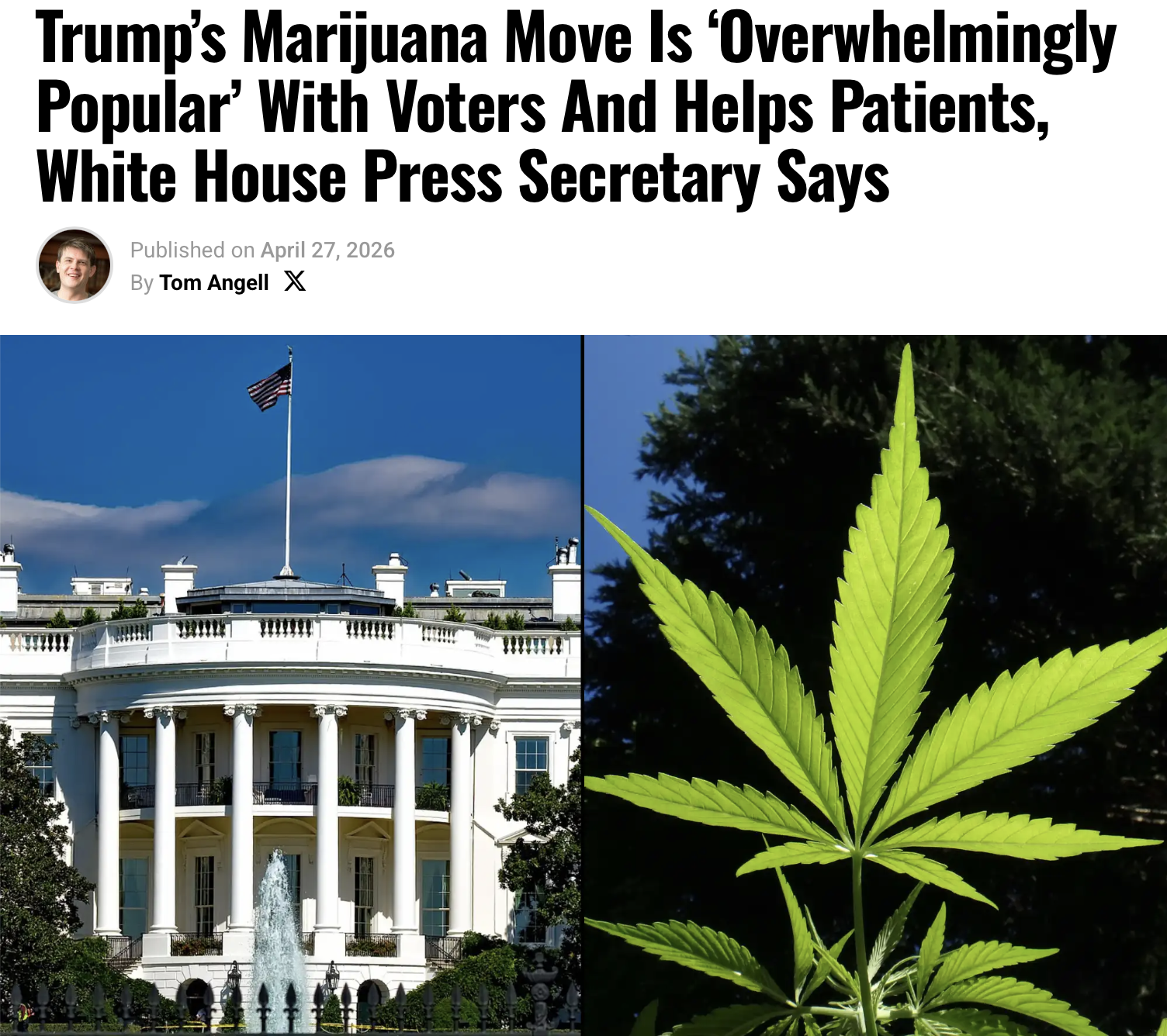 The Trump administration is moving to federally reschedule marijuana because cannabis reform is “overwhelmingly popular” with voters and because doing so will help people who need access to the drug for medical purposes, the White House press secretary says.“The president hears from a number of people, both inside and outside the administration, and frankly, the American people,” Karoline Leavitt, President Donald Trump’s press secretary said on Friday. “If you do look at the public polling on this issue, it is overwhelmingly popular with the vast majority of Americans.”She added in response to a question about the issue from a Real America’s Voice reporter that “rescheduling will lead to more research into cannabis as a drug, especially for those who need it for medical treatment.”“And so the president was willing to take this step to do that at the behest of the American public, who largely support it, and many of his health advisors on his team who he spoke with about it,” Leavitt said, referencing comments that Trump made a day earlier after the Department of Justice announced that cannabis rescheduling was happening.During a press event in the Oval Office on Thursday, Trump spoke about the medical benefits of marijuana.“A lot of people are suffering from big problems, which this seems to be the best answer,” he said. “They’re very happy about it. So the rescheduling is starting, and that’s a big thing, rescheduling.”AG Todd Blanche on Thursday announced that rescheduling is finally happening through a process that will happen in phases.Under an order signed by Blanche, marijuana products regulated by a state medical cannabis license will immediately move to Schedule III, as will any marijuana products that are approved by the Food and Drug Administration (FDA).>https://www.marijuanamoment.net/trumps-marijuana-move-is-overwhelmingly-popular-with-voters-and-helps-patients-white-house-press-secretary-says/