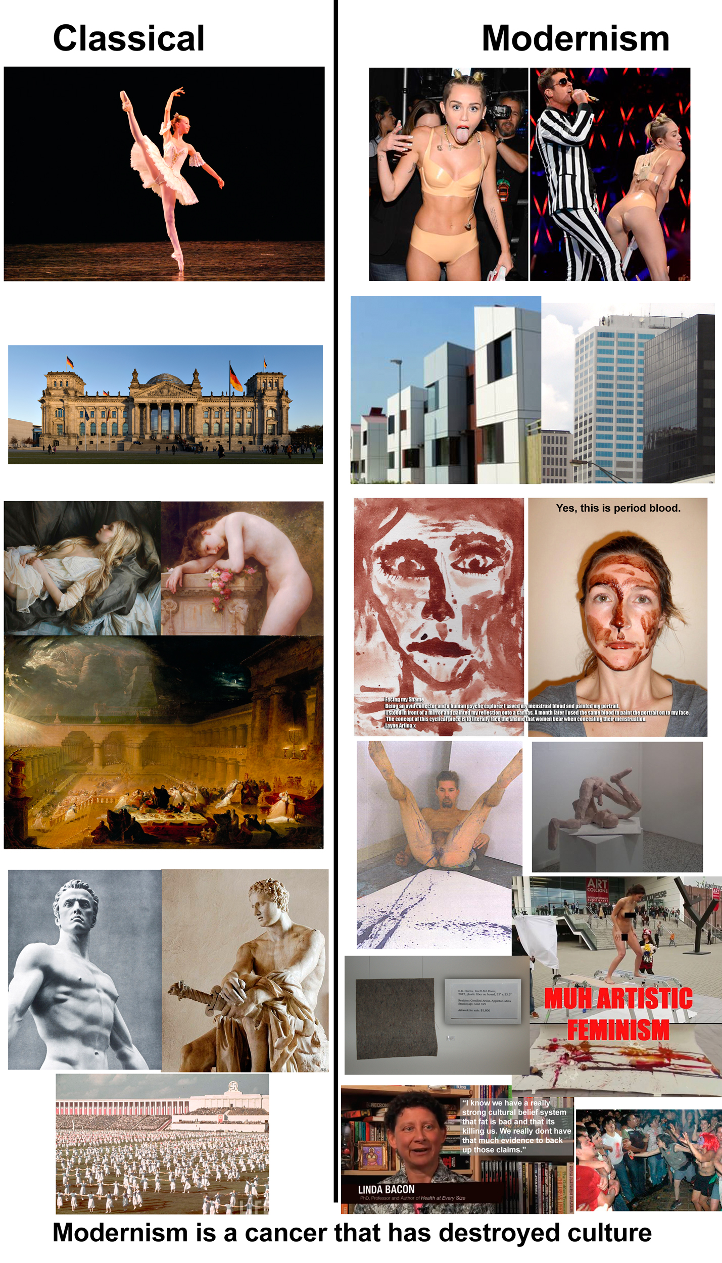 >>533987130Modernism and postmodernism are continuations of the same ethos of rejecting tradition and beauty and pushing for degradation of societal standards. >>533987403>you'd understand Picasso and Duchamp's progressionA bunch of liberal hippies who did art to manipulate the masses. >changing the purpose of art from representing what exists to providing a thought in contextRepresentation of thoughts and concepts already existed long before, but tying them to reality actually made them valuable. Thoughts beyond reality are delusions, that is what differences valid philosophies from shit like solipsism or subjectivism which exists to feed the ever hungry ego from arrogant idiots, including the two moronic "artists" you mentioned.