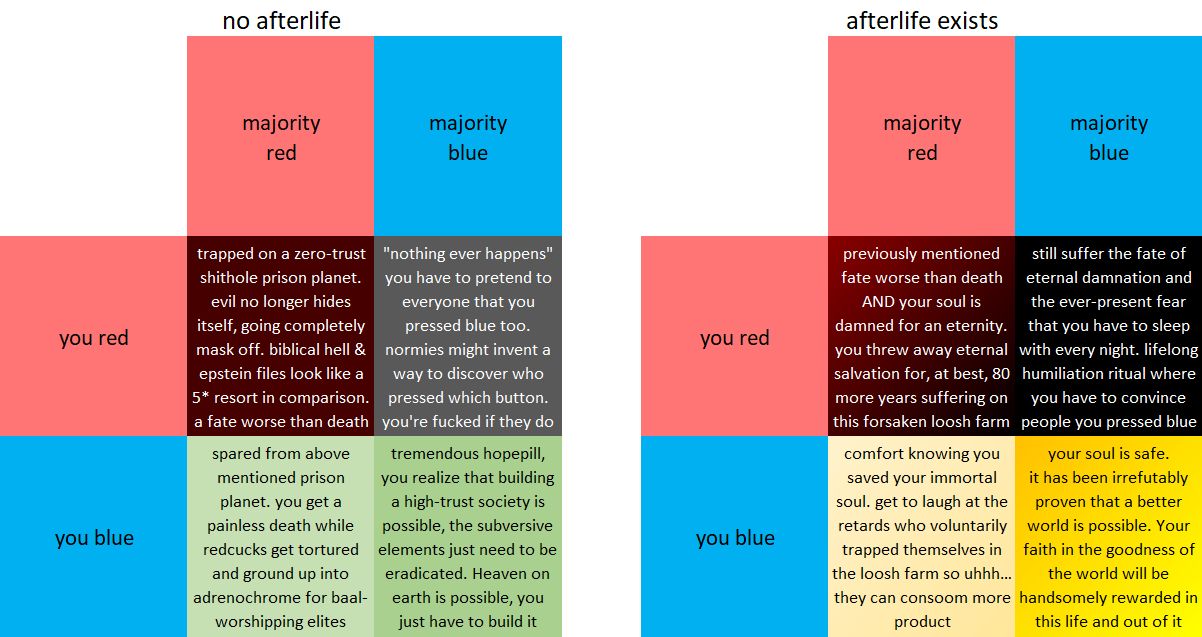 >>533988760That is a very dishonest way of framing it. Death only becomes a possibility with the blue button. Red button is the equivalent of simply not playing and walking away. Blue button pushers are entering the ultimate death gamble for no fucking reason.>>533988154