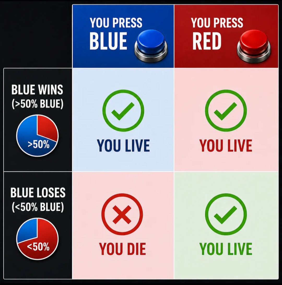 >>533993753The original rules say it's a private vote. No collaboration, no organization, no coercion, no leadership etc. In a vacuum blue makes zero sense because it's a gamble, while red is not a gamble. Those who choose blue must, logically, either be suicidal or weirdly flippant about their own survival.