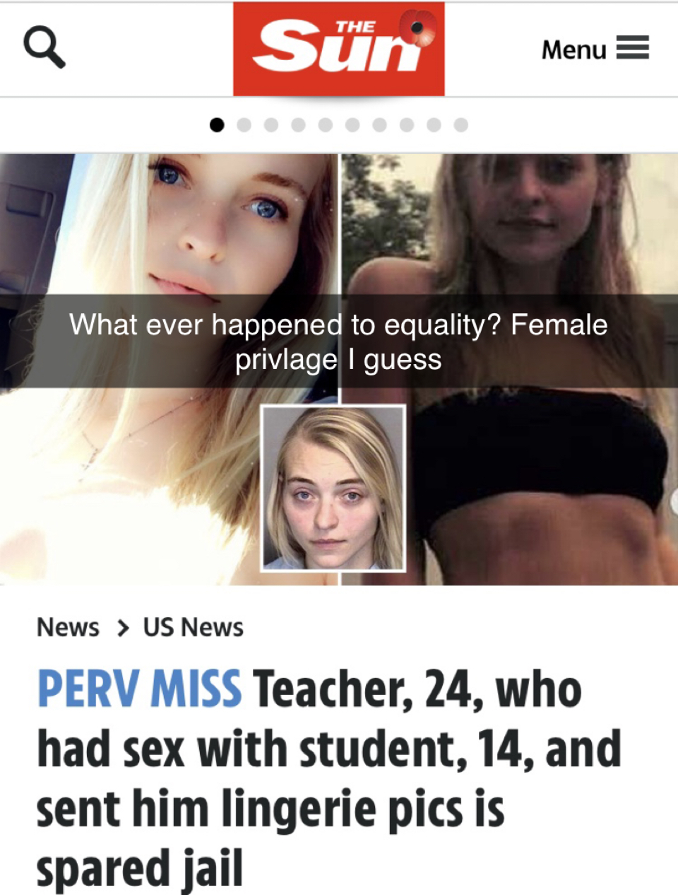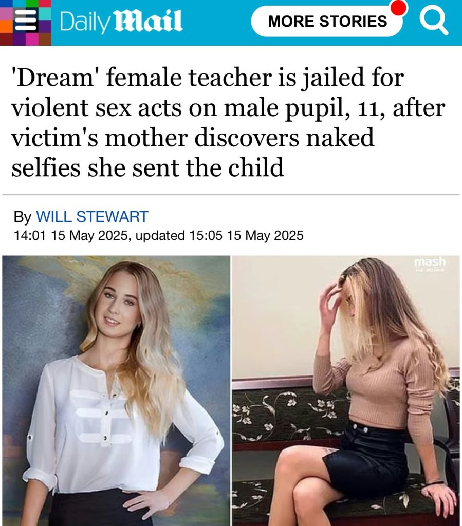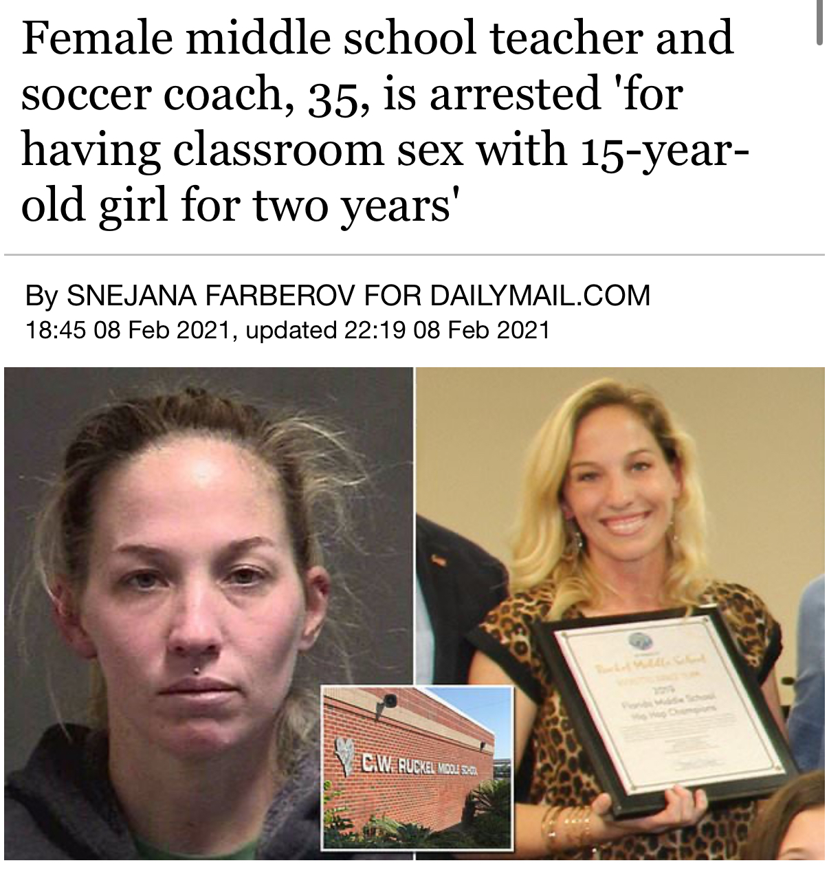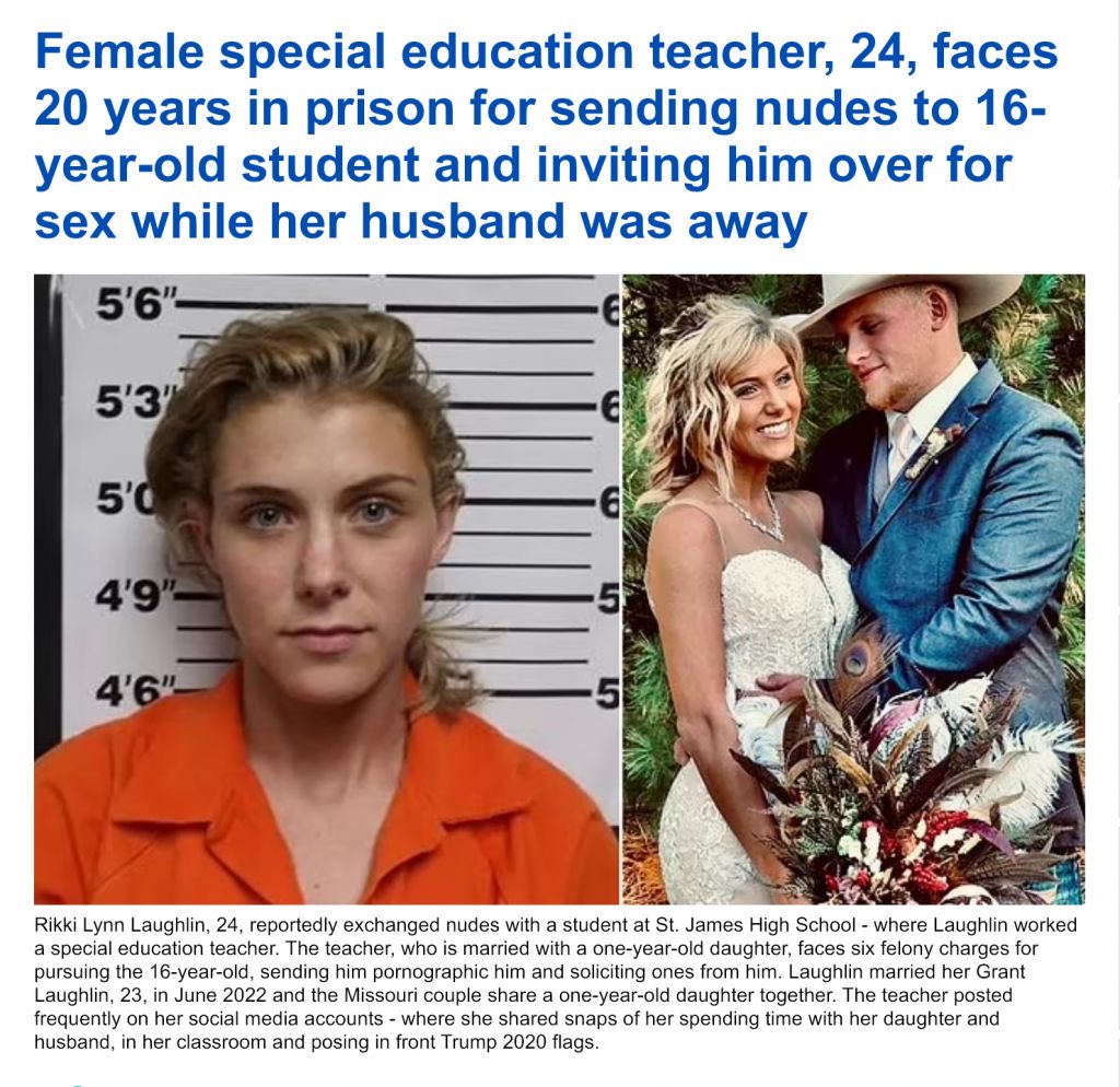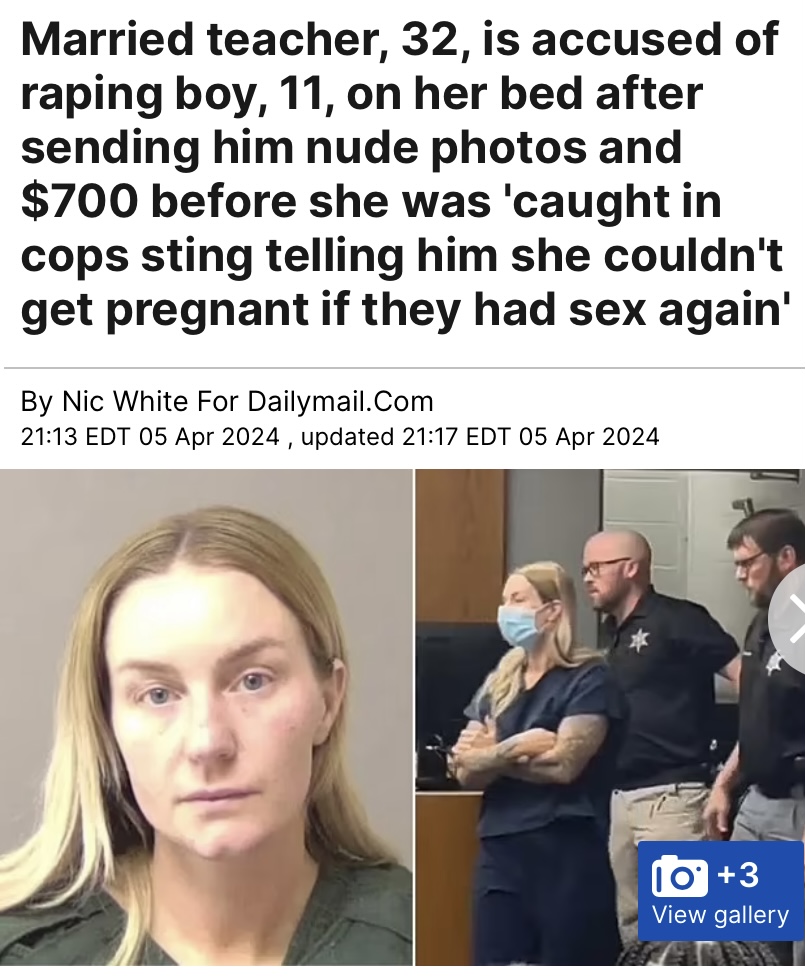 >>533992565She was arrested on Thursday, April 23rd. Since then, 4 more teachers have been arrested for having sex with one of their underage pupils. 3 of the teachers were women. Over 2 teachers, on average, are arrested every single school day in the US. With over 75% of them being female teachers.