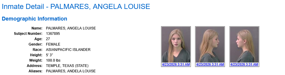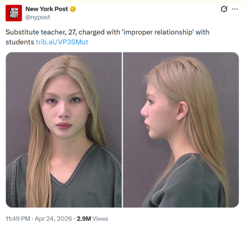 >Angela Palmares, 27, was arrested without incident in Bell County on Wednesday and charged with improper relationship between an educator and student, a second-degree felony. >She is being held on a $150,000 bondhttps://nypost.com/2026/04/24/us-news/substitute-teacher-27-charged-with-improper-relationship-with-students/