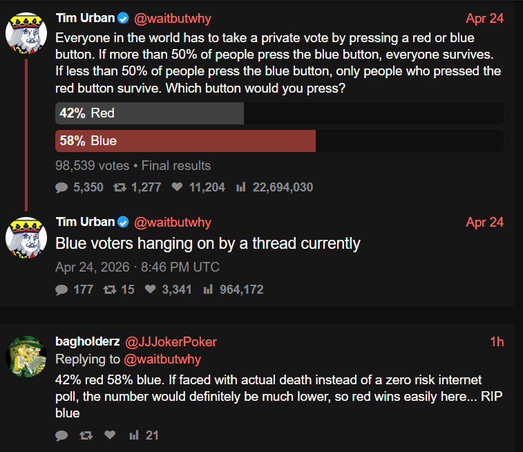 You get by default all the dregs of humanity with red. No selfish misanthropic asshole will ever press blue. You also get all the cowards that were too afraid to risk it. And you lose tons and tons of good moral people, not all of them mind you, but most. You lose tons of selfless people exactly because they were selfless.