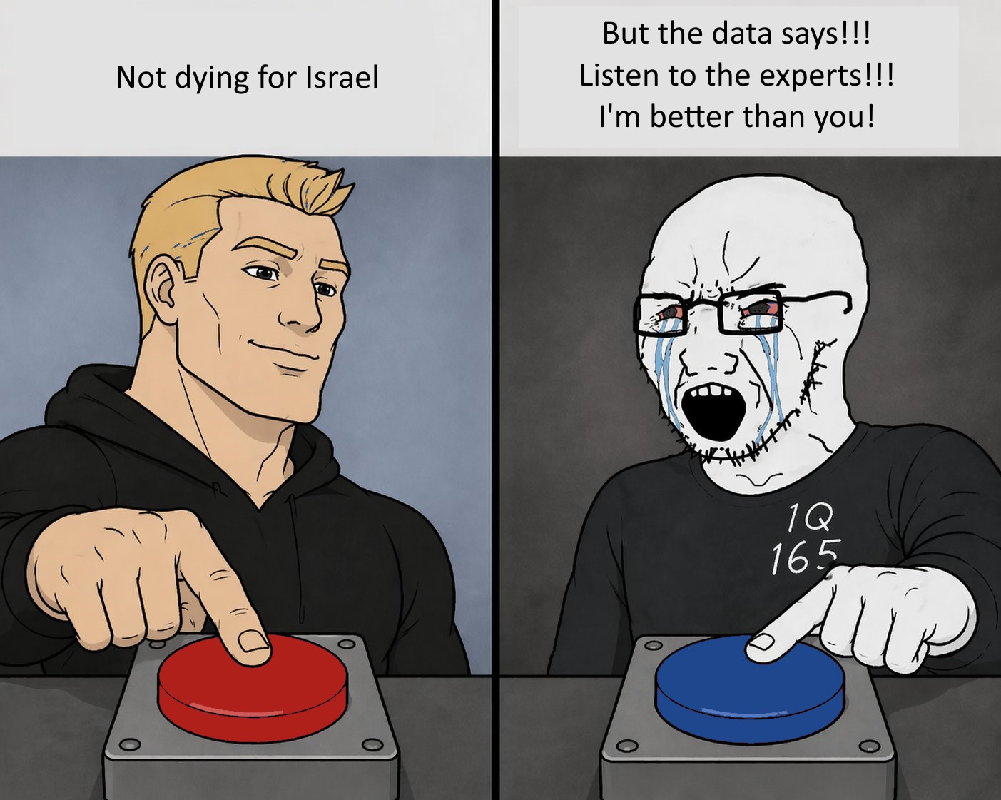 >Red is sitting at home letting patriots die for you. Blue is joining the army because the more powerful the army against Iran is the fewer casualties there will ultimately will be. Blue is a morally just option