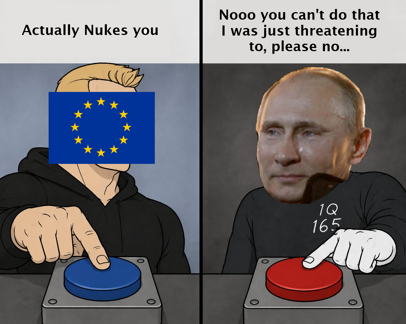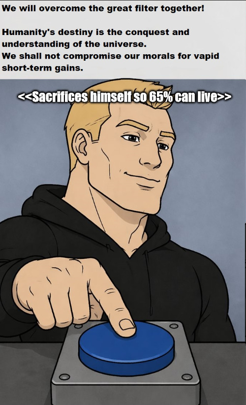 All these guys who believed in civic duty pressed blue because of that very belief. All the high T guys who were gonna change their countries for the better pressed blue, in real life these are the guys who enlist in wars to save the weak and protect their countries. The pussies stayed behind in safety because they were scared, ahm ahm red pushers. In fact all the psychos that remain will try fuck over the pussies that voted red for their own gain and there will be no brave and well meaning people to stop that.