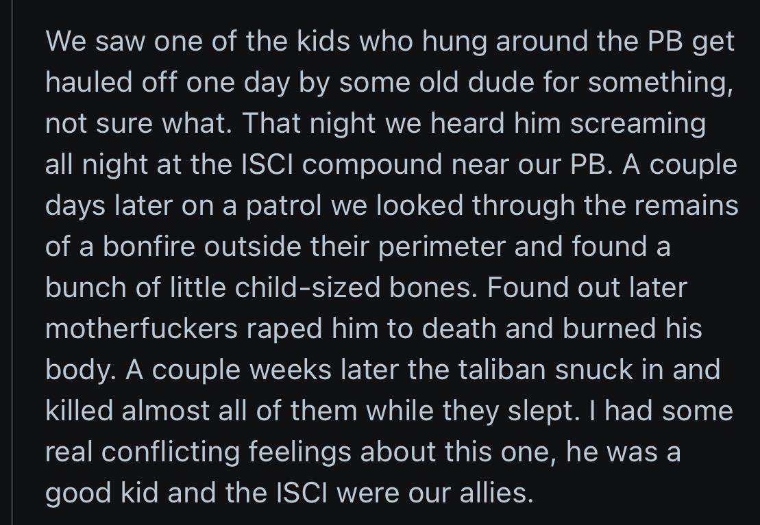 >>533997335I'm confused as to whether you realise the rapists here were Afghanis embedded with the US soldiers.