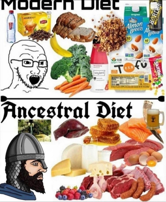 >>534001263The "ancestral diet" part is misleading though.Meat was a luxury only elites could afford. And even then never in the quantities shown in the pic.In fact most people rarely had over 1.5k calories per day, most of the time sub 1000 especially when it was time for yet another endless war. If the modern man ate not more than 1500 cal/day or less, we would also have less health problems (again).Although I agree that the invention of sugar has been done by Baphomet or Satan himself and sugar should be outlawed harder than crack cocoaine.