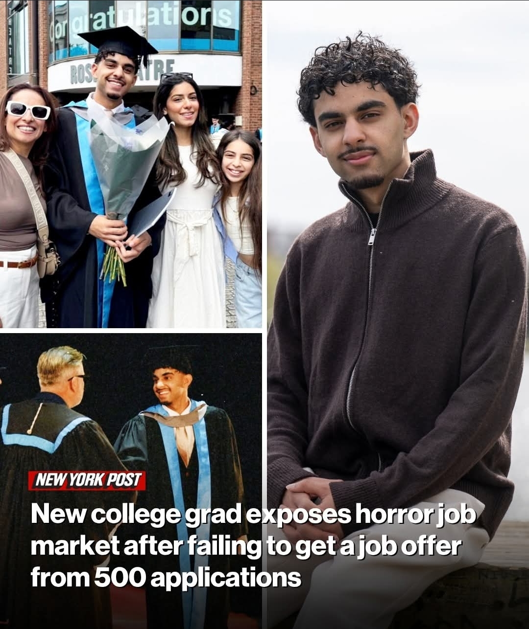 >>534000002>A 21-year-old who graduated at the top of his class after spending roughly $125,000, including expenses, on his college degree said “the system is broken” after he applied for 500 jobs and didn’t get one.>Khaled Sharif, 21, earned a degree in digital media tech from Kingston University just outside London, England. He began applying for relevant roles after he graduated in 2025, news agency SWNS reported.>But despite submitting 500 applications, he said, he’s had less than 20 job interviews and has yet to land a job — despite expanding his search into sales and other sectors that he “didn’t want to work in.”>Sharif, who holds UK residency through his mother, moved to the United Kingdom from Qatar at age 18.>At the time, he said, he was the envy of his peers, thanks to the UK’s reputation for offering some of the “best opportunities in the world.” But Sharif said he believes his degree is not the problem. >Instead, he said, the job market is a “broken system” that is “flooded” with graduate applicants.>“It does make me really upset. It’s really stressful,” he told SWNS. “I got [a] top-of-my-class [designation], but I can’t find anything. Kingston’s not a top university, but I just can’t find anything — and I’ve applied for everything. If people got a lower grade, how hard would it be for them?”