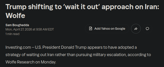>Wolfe Research analyst Tobin Marcus noted that U.S.-Iran talks scheduled for the weekend in Islamabad never materialized, yet Trump responded with notable restraint. "We have all the cards, they have none! If they want to talk, all they have to do is call!!!" Trump said.https://www.yahoo.com/news/articles/trump-shifting-wait-approach-iran-135837013.html