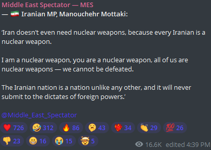 >Every Iranian citizen is a nuclear weapon.He screams as he sobs into his pillow and fearfully listens every night to the sounds of American bombers casually circling over his capital, waiting for the bombs he know will soon drop.