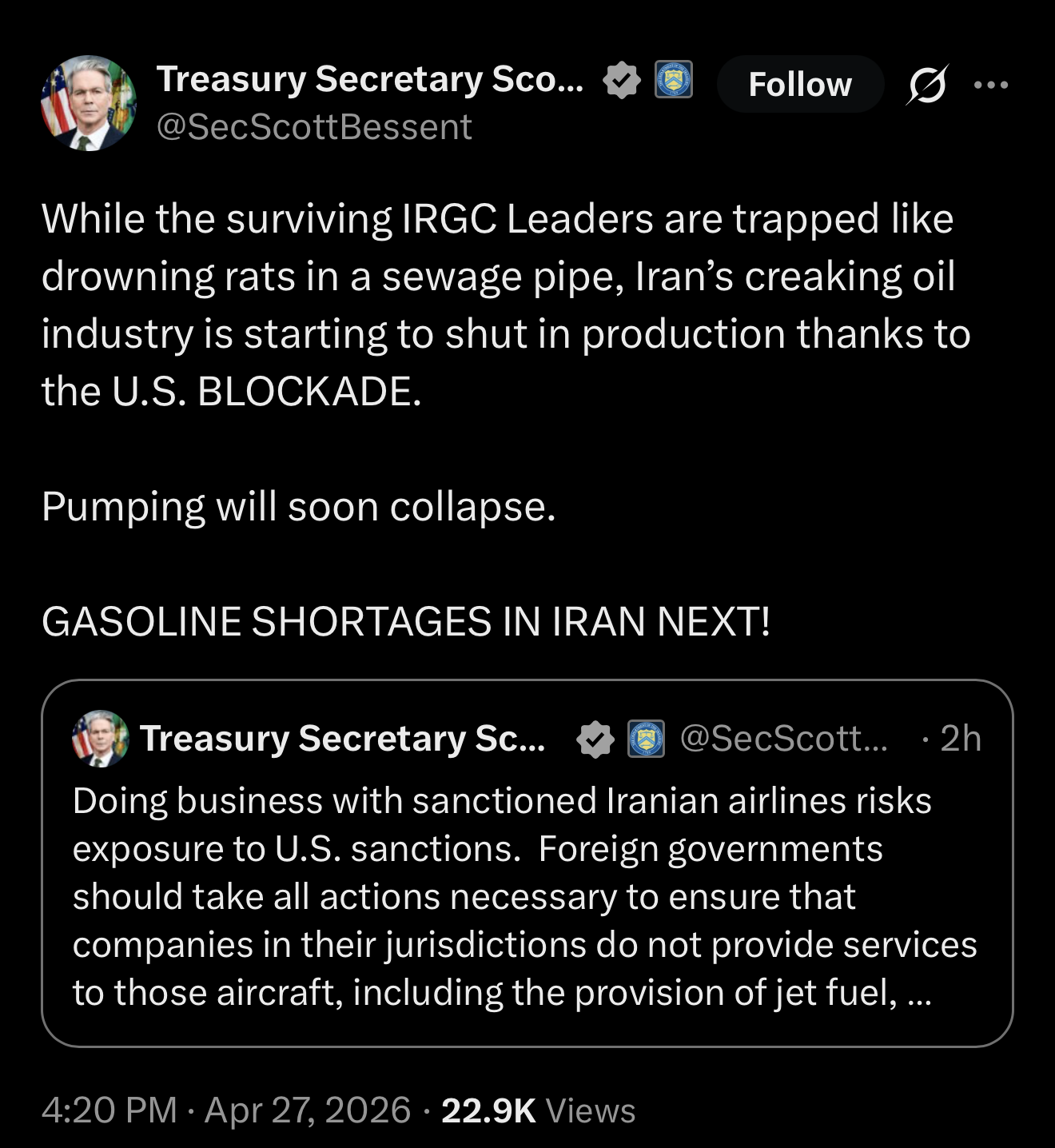I've said it before, and I will say it again. Bessent might be a prancing sissy lala gay homo who sucks dick for cock, but he is also the best Treasury Secretary in the entire history of the United States and is single handedly waging economic warfare on the entire world (and winning).https://x.com/SecScottBessent/status/2048889949194166316