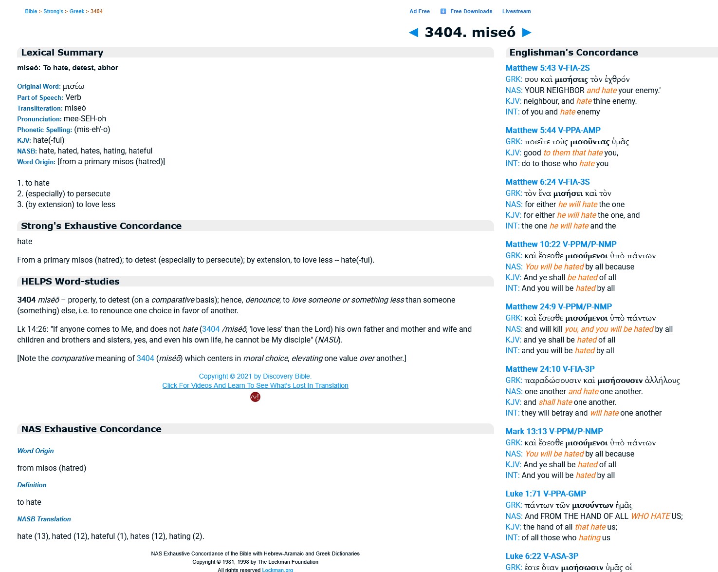 >>534005056We can consult Strong's or another concordance. The word in Greek is μισέω, miseo, coming from the same root as our miso-, hatred. Strong's Greek number 3404. It means>1. to hate>2. (especially) to persecute>3. (by extension) to love lessNot only is "to hate" or "hate" a correct translation, "to persecute" is also a correct translation leading to another possible translation>If anyone comes to me and does not persecute his own father and mother and wife and children and brothers and sisters, yes, and even his own life, he cannot be my disciple.Moreover the word miseo or a variant depending on tense and quantifier is used throughout the New Testament and consistently translated into "hate" because it makes sense in all cases. Should John 3:20>For every one that doeth evil hateth the light, neither cometh to the light, lest his deeds should be reproved.Read >For every one that doeth evil loveth less the light, neither cometh to the light, lest his deeds should be reproved.because one can apply an extension to the Koine word "to hate," "hate," or "to persecute?" That hundreds of Koine scholars have been mistranslating the variants of miseo according to your opinion?