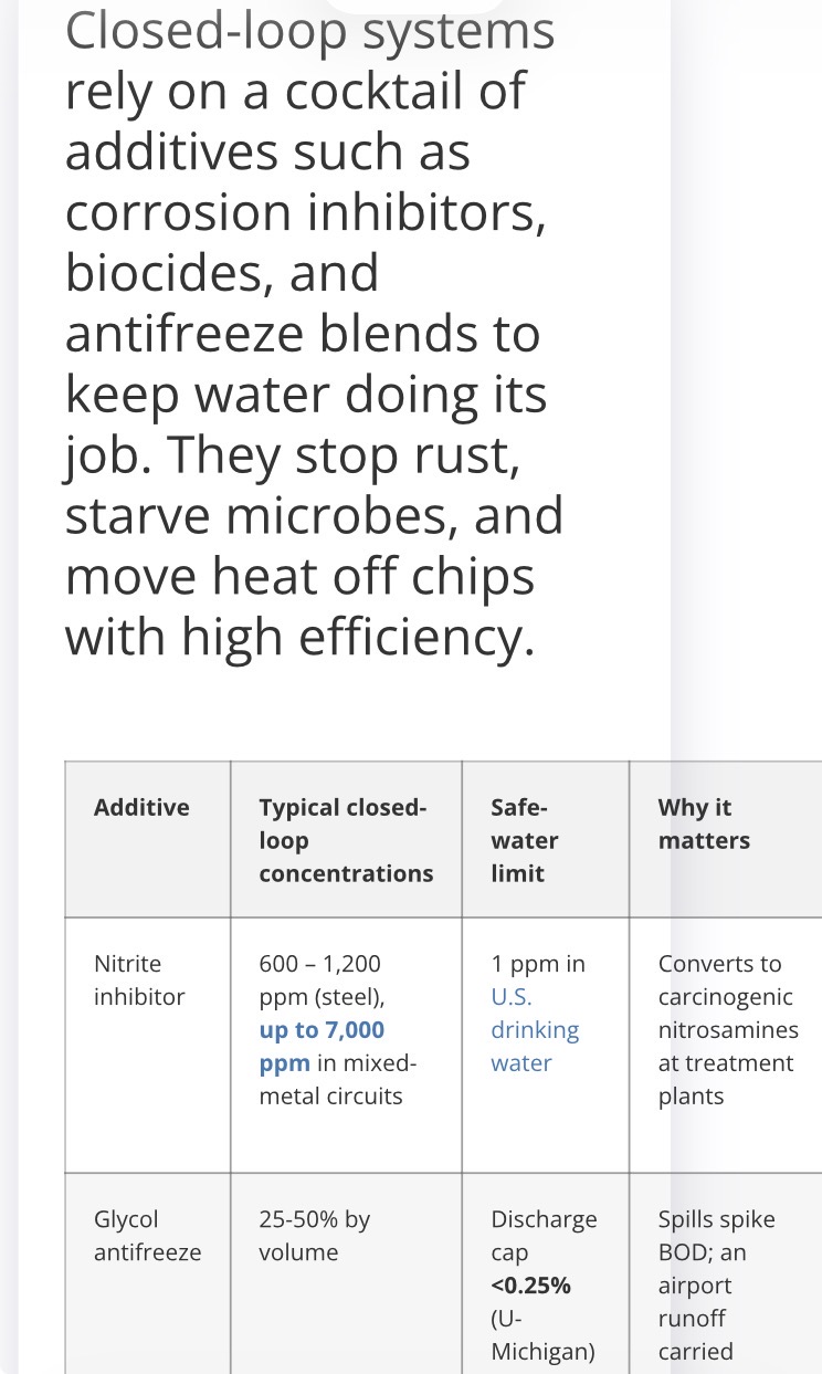 >>534012553Some data centers use antifreeze, and also the hot water causes chemicals to leech out of the pipes and fittings, so it needs to be treated afterwards.https://ketos.co/closed-loop-cooling-water-saver-or-chemical-time-bomb