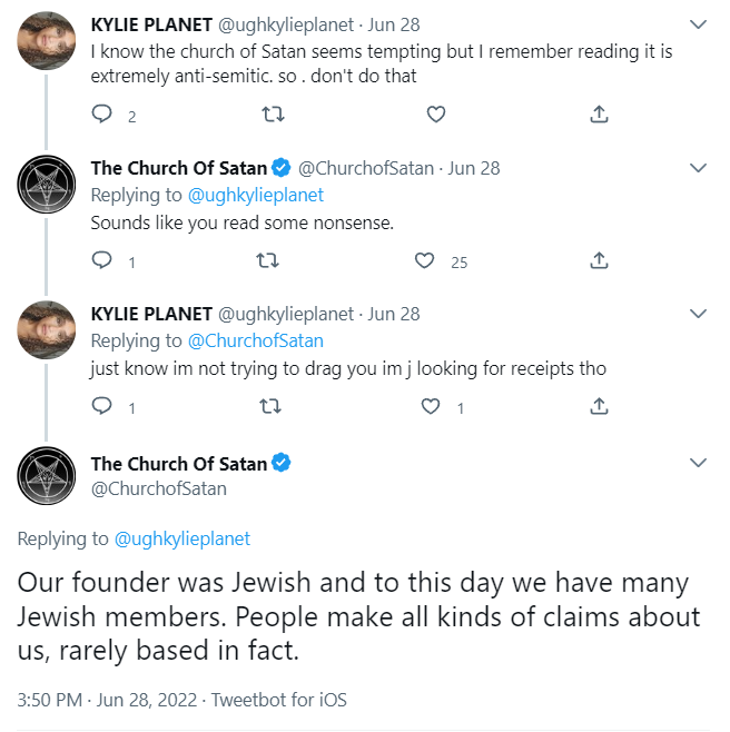 >>534017386I never claimed to be an expert on religion. The fact that they do not actually worship Satan is revealed in the introductory paragraphs of their wikipedia entry:https://en.wikipedia.org/wiki/Church_of_SatanSo you clearly didn't read that, or you've come across evidence which debunks that. If it's the latter please provide what you found.
