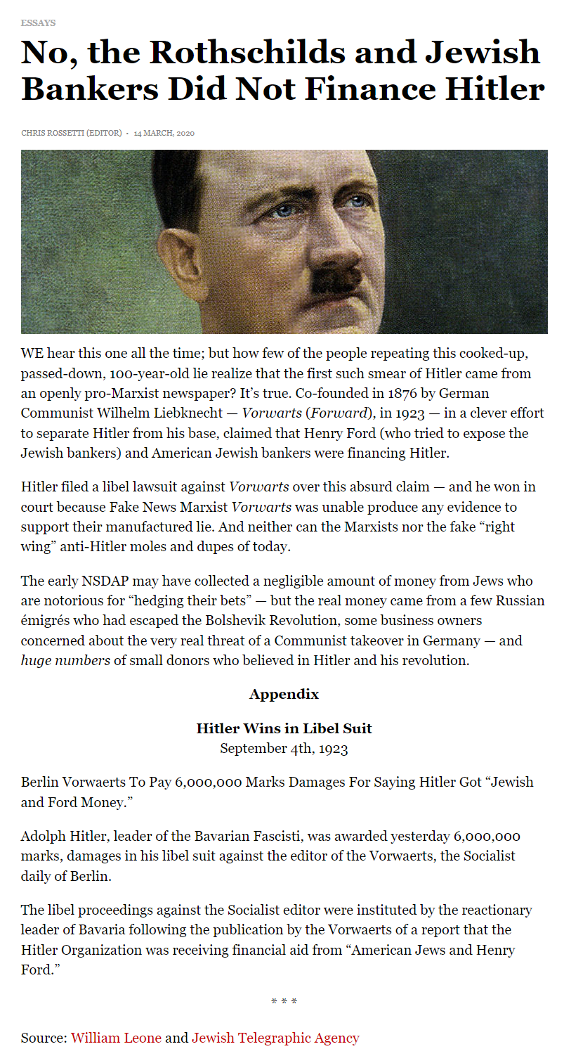 >>534015780Funniest part about this "kikes financed Hitler" is that the jews actually tried that pilpul back when Hitler was alive :DDD 100 years later the jews still go onThey truly never stop lying until they are all dead