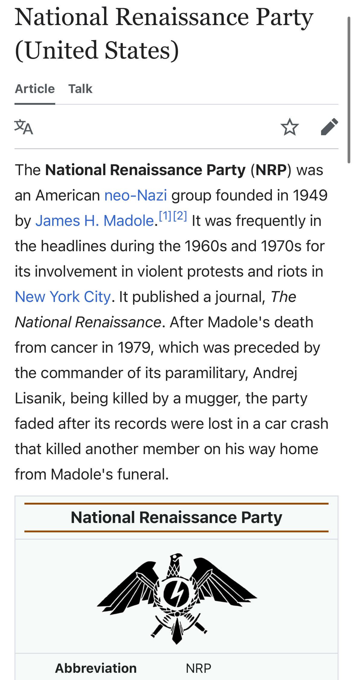 >>534014203Interesting end to the NRP.>Following (leader) Madole's funeral, his mother turned over the NRP's records to loyalist Jean Charlebois. On his way home, following the service, Charlebois vehicle struck a concrete abutment on the highway. Charlebois was killed, and the NRP's records flew away in the wind. By 1981, the party was defunct.Didn’t know Nicholas Schreck was Barry Dubin, lol, the least scary name ever. His wiki simply says he changed his name without saying what it originally was. You’d think his political opponents would dox his jewish history to embarrass him, but they help hide it.