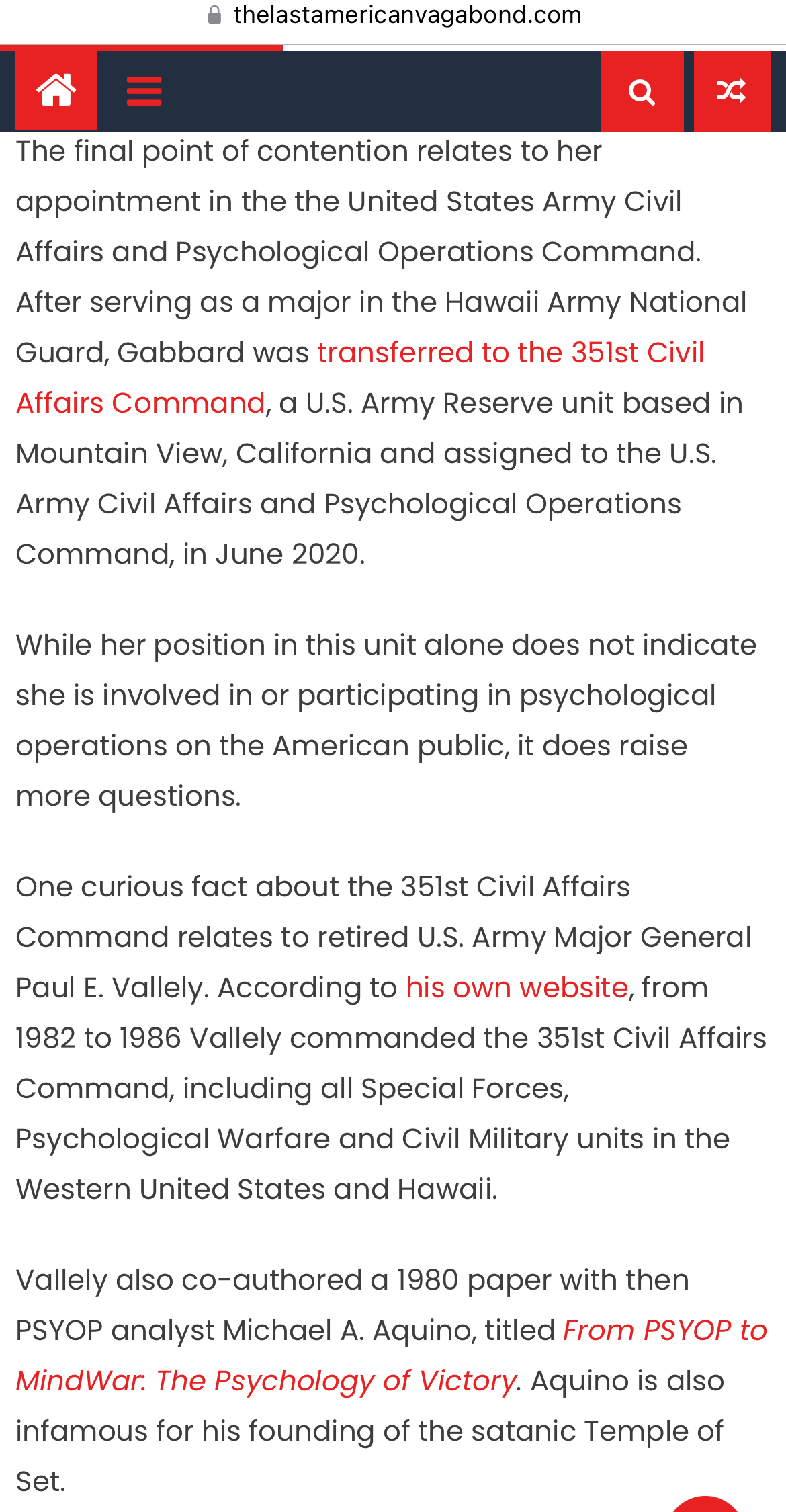 >>534012112>>534012187 That’s a stretch, Tulsi worked for the 351st Civil Affairs Command, a U.S. Army Reserve unit based in Mountain View, California and assigned to the U.S. Army Civil Affairs and Psychological Operations Command, in June 2020.MINDWAR co-author Mike Vallely used to be in charge but left in 1986.Still interesting and relevant but not what was claimed.