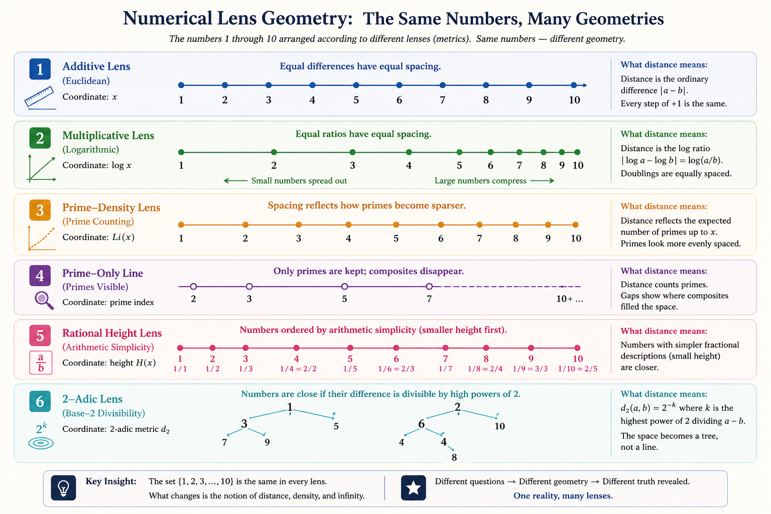 ## *4. Adelic Unification: The Global Balance*The theory culminates in *Adelic Geometry, which uses the **Product Formula* to unify all possible lenses. It states that for any rational number $q$:$$\prod_{v} |q|_v = 1$$This formula acts as a "conservation law" of arithmetic size. It ensures that if a number is "small" in one lens (like the $p$-adic lens), it must be correspondingly "large" in others (like the real Euclidean lens), maintaining a global balance.---## *5. Summary of Principal Lenses*| Lens | Metric / Scale | Interpretation || :--- | :--- | :--- || *Additive* | $|a-b|$ | Standard linear distance. || *Multiplicative* | $|\log(b/a)|$ | Relative ratios and growth. || *Prime-Density* | $\operatorname{Li}(x)$ | The "natural" rhythm of primes. || *Diophantine* | $q^{-\nu}$ | How well irrationals are "clouded" by rationals. || *$p$-adic* | $|x-y|_p$ | Closeness based on prime divisibility. || *Algorithmic* | $K(\alpha)$ | Information density and compressibility. |### *The Final Takeaway*In Numerical Lens Geometry, a number is no longer a static point on a line. It is a *multi-dimensional resonance* that changes its "shape" and "distance" depending on how you choose to measure it. To know a number is to understand its entire profile across every available lens.